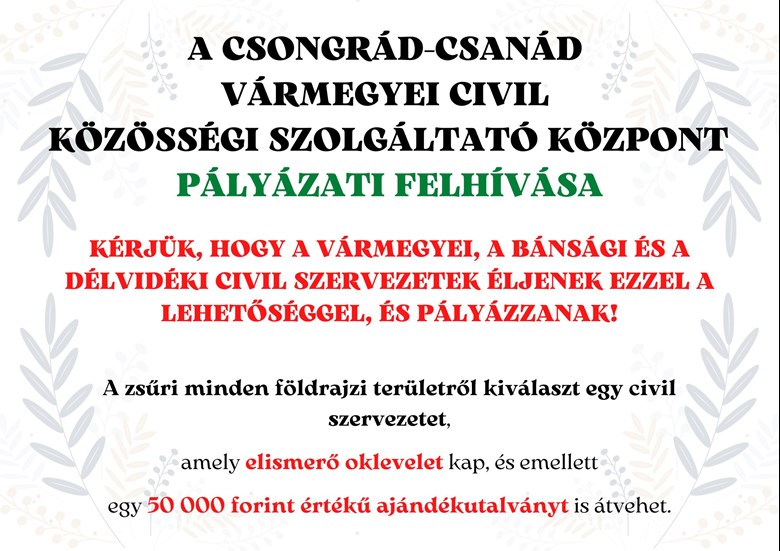 Csongrád-Csanád Vármegyei Civil Közösségi Szolgáltató Központ ezúton hirdeti meg pályázati felhívását a vármegyei, a bánsági, valamint a délvidéki civil szervezetek számára.