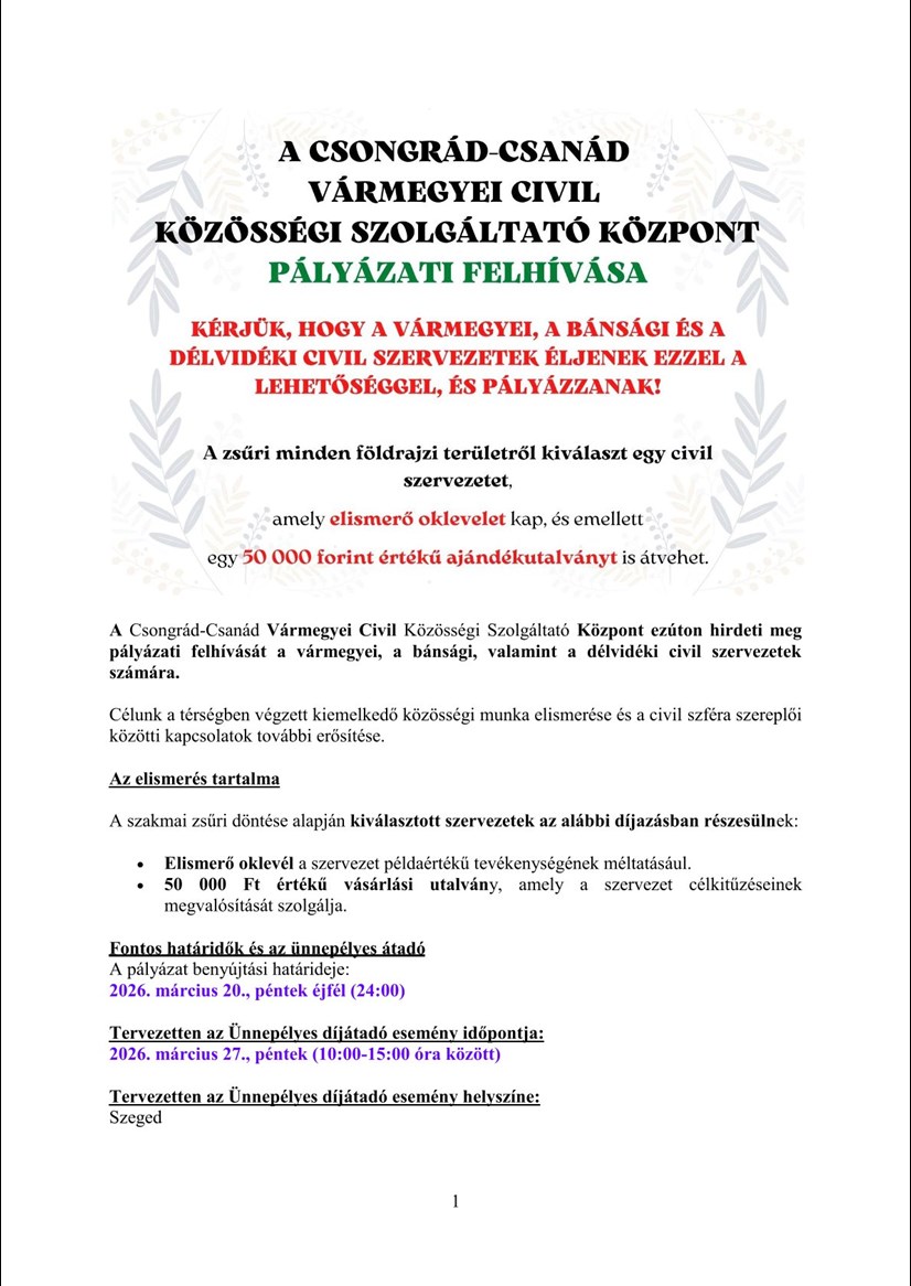 A Csongrád-Csanád Vármegyei Civil Közösségi Szolgáltató Központ ezúton hirdeti meg pályázati felhívását a vármegyei, a bánsági, valamint a délvidéki civil szervezetek számára.