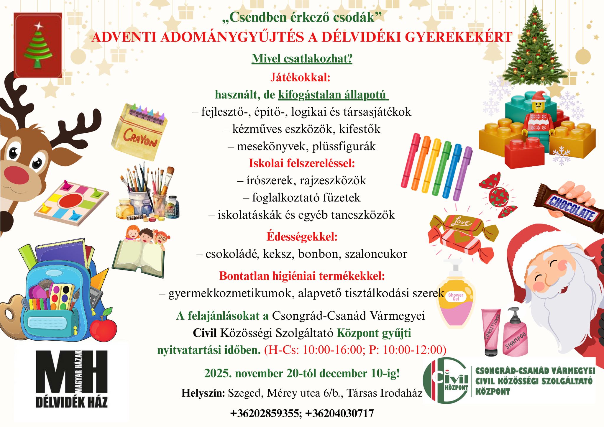 A Csongrád-Csanád vármegyei Civil Közösségi Szolgáltató Központ és a Délvidék Ház az óbecsei INNOVA Alkotók és Újítók Társasága Adventi kavalkád programjához kapcsolódva adománygyűjtő akciót hirdet mintegy 80 délvidéki, hátrányos helyzetű vagy nehéz sorsú magyar gyermek karácsonyi ajándékainak összeállítására.