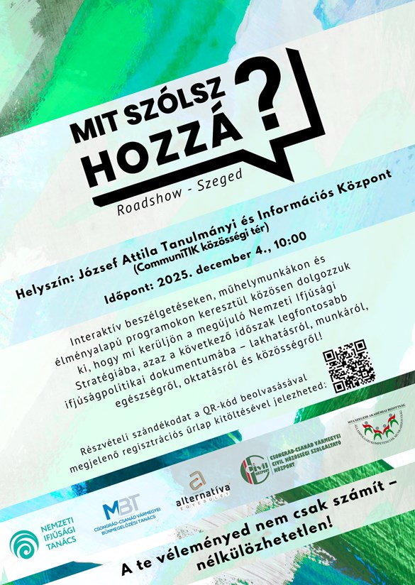 👉 Szegedre érkezik az országos Ifjúsági Stratégia Roadshow, mely a Kulturális és Innovációs Minisztérium kezdeményezésére, a Nemzeti Ifjúsági Tanács szervezésében járja az országot.