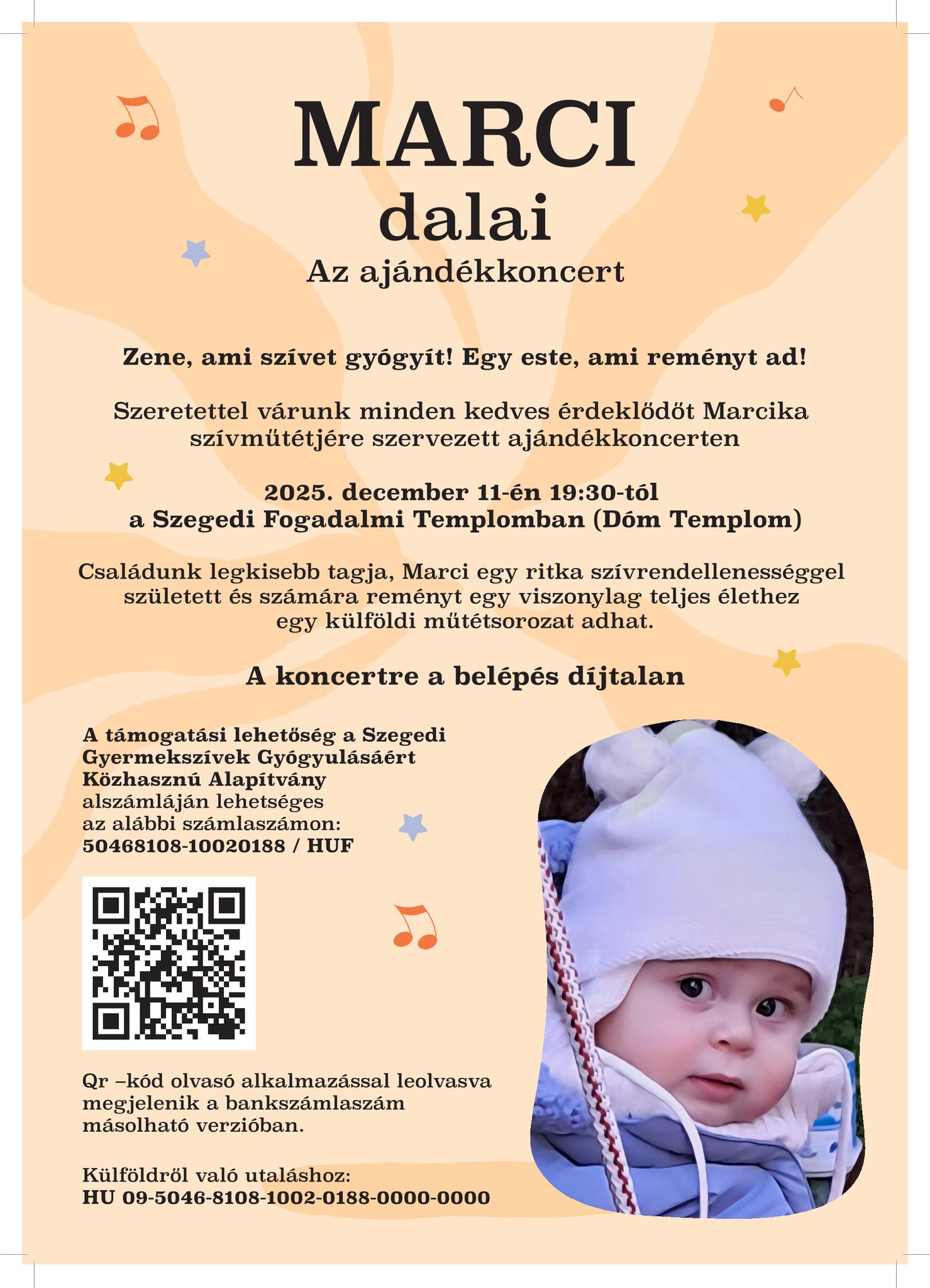 A Szegedi Gyermekszívek Gyógyulásáért Közhasznú Alapítvány jótékonysági koncertet szervez "Marci dalai" címmelA koncert időpontja:2025. december 11., csütörtök 19:30 A koncert helyszíne: Szegedi Fogadalmi Templom (a Szegedi Dóm) Marci ritka szívrendellenességgel született, a koncert bevételét a kisfiú műtétjeire gyűjti és ajánlja fel a szervező. Adományozni a QR kód leolvasásával tudsz, lásd a plakáton! Segítsünk Marcinak viszonylag telj...