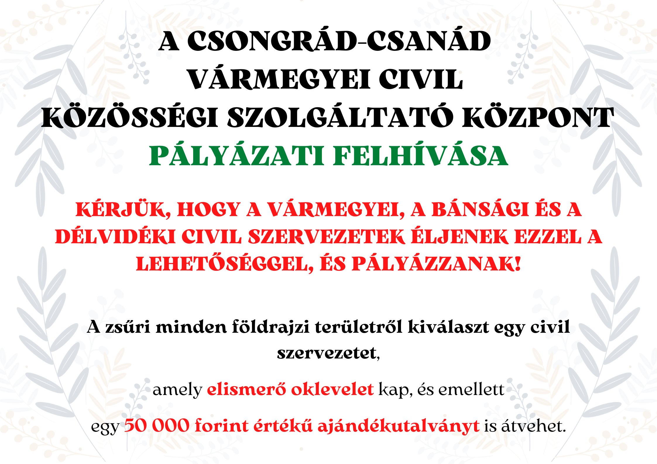 A Csongrád-Csanád Vármegyei Civil Közösségi Szolgáltató Központ pályázati felhívásaA Csongrád-Csanád Vármegyei Civil Közösségi Szolgáltató Központ ezúton hirdeti meg pályázati felhívását a vármegyei, a bánsági, valamint a délvidéki civil szervezetek számára. Célunk a térségben végzett kiemelkedő közösségi munka elismerése és a civil szféra szereplői közötti kapcsolatok további erősítése. Az elismerés tartalma A szakmai zsűri döntése alapján...