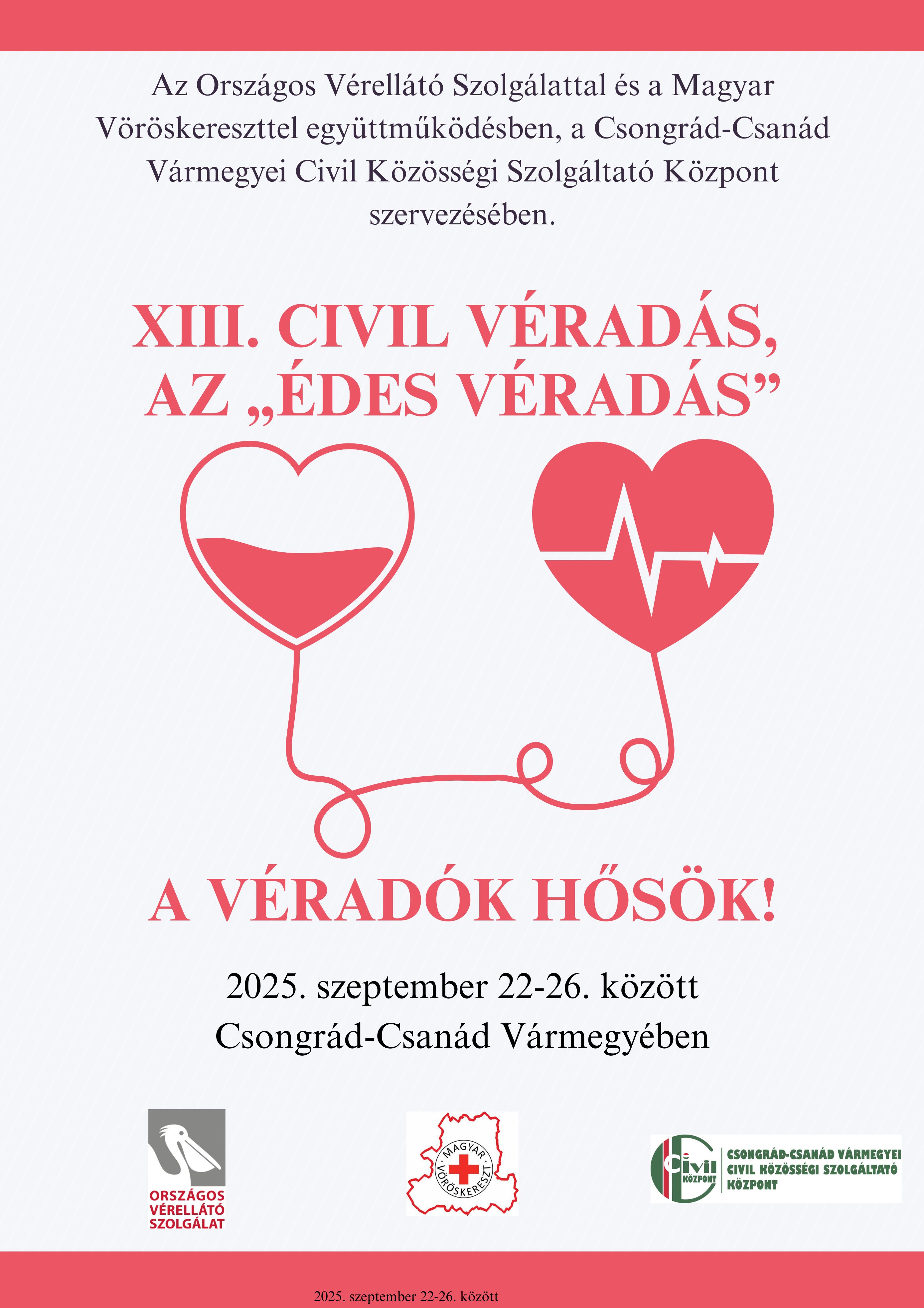 Az Országos Vérellátó Szolgálattal és a Magyar Vöröskereszttel együttműködésben, a Csongrád-Csanád Vármegyei Civil Közösségi Szolgáltató Központ szervezésében. XIII. Civil Véradás, az "ÉDES VÉRADÁS" A Véradók, HŐSÖK! 2025. szeptember 22-26. között Csongrád-Csanád Vármegyében