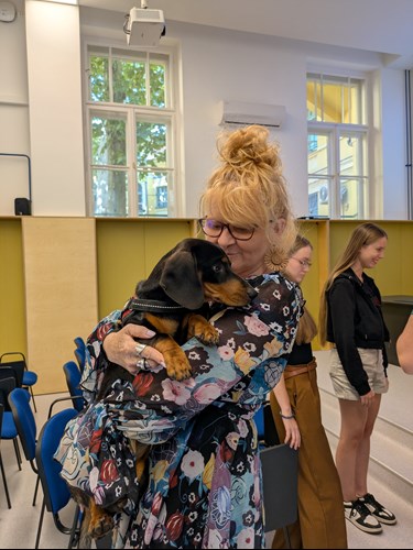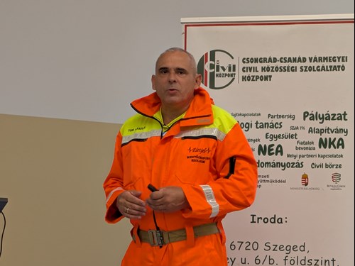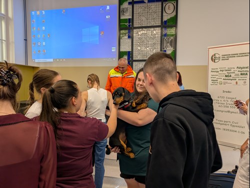 Az elnök az Életjel Mentőkutyás Kutatóegység tevékenységeit, kudarcait és sikereit mutatta be a civil kurzus hallgatóinak.